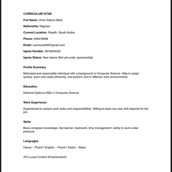 Profile Summary My name is Umar Adamu Bello, also known by the nickname Yayangida. I am a Nigerian national, currently residing in Riyadh, Saudi Arabia, where I am employed. I hold an academic background in Computer Science and possess practical skills in tailoring as well as experience in business and entrepreneurship. Over the years, I have gained diverse professional and personal experiences, for which I am grateful to Allah — Alhamdulillah.Birthdate