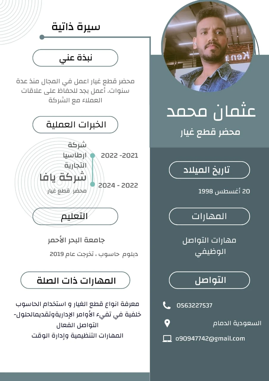 ~سيرة ذاتية~ الاسم : عثمان محمد محمود الجنسية : سوداني ~تاريخ الميلاد ~ 20.اغسطس 1998 _المهارات _ مهارات التواصل الوظيفي _ التواصل 0504428957 السعودية الدمام ايميل :o90947742@gmai.-.نبذه عني - محضر قطع غيار اعمل في المجال منذ عدة سنوات اعمل بجد للحفاظ علي علاقات العملاء بالشركة -الخبرات العملية _ عملت في شركة ارطاسيا التجارية بوظيفة عامل مكينة منذ 2021 _ 2022 عملت في شركة يافا العالمية بوظيفة محضر قطع غيار منذ 2022-2024 _التعليم- جامعة البحر الأحمر دبلوم حاسوب . تخرجت عام 2019 _المهارات ذات الصلة - معرفة انواع قطع الغيار واستخدام الحاسوب خلفية في تنفيذ الأوامر الإدارية وتقديم الحلول _التواصل الفعال -المهارات التنظيمية وإدارة الوقتBirthdate