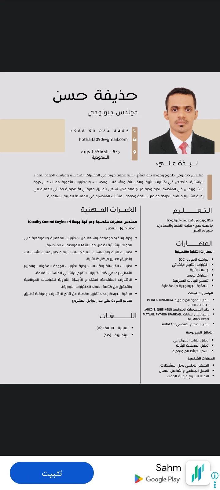 اسعى للحصول على فرصة مهنية في بيئة عمل محفزة لتطوير مهاراتي العملية والمهنية والمساهمة بفاعلية لتحقيق أهداف الشركة من خلال العمل الجماعي والدقة والتميز مع السعي المستمر لاكتساب خبرات جديدة في مجالي المهني والعملي والعلمي هندسة جيولوجي هندسة لابتوب واعمال التمويناتPetsa ng Kapanganakan
