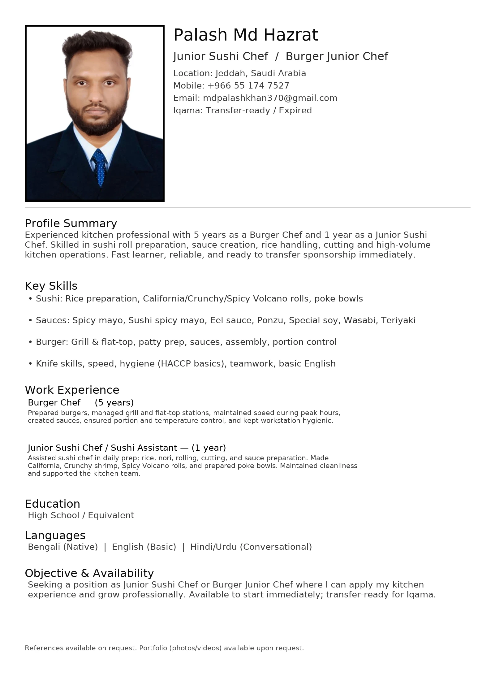 Junior Sushi & Burger Chef with 5+ years of experience in fast-paced kitchen environments. Skilled in sushi roll making, sauce preparation, food hygiene, and workstation organization. Strong ability to learn quickly, work under pressure, and maintain high quality standards. Currently based in Jeddah and open for new opportunities.जन्म तिथि