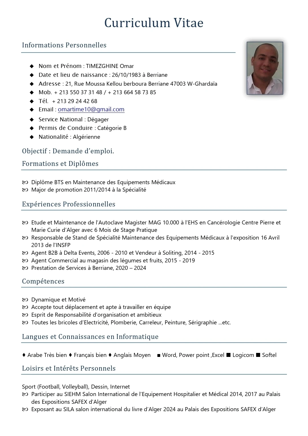 معكم الأخ عمر تمزغين تقني سامي في صيانة المعدات الطبية متفوق الدفعة 2011/2014 بولاية غرداية - الجزائر 🇩🇿 ومتربص لستة أشهر في المؤسسة المتخصصة في مكافحة السرطان المستشفى الجامعي مصطفى باشا . وأعمل حاليا كعون تجاري ولدي خبرة 9 سنوات في ميدان التجارةTanggal Lahir