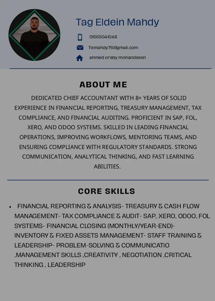 As a Accountant manager , I manage the financial operations of the company's branches, ensuring compliance with budget and tax regulations. I have over years of experience in this role, where I handle daily transactions, prepare half-yearly budgets, and follow up on banking and insurance transactions. I also Audit in planning and implementing audit assignments, preparing accounting data analysis, and reporting to CEO . I hold a Bachelor's degree in Foreign Major trading from Helwan University , which has enhanced my communication skills and cultural understanding. I am passionate about delivering accurate and timely financial information to support business decisions and growth.Doğum Tarihi