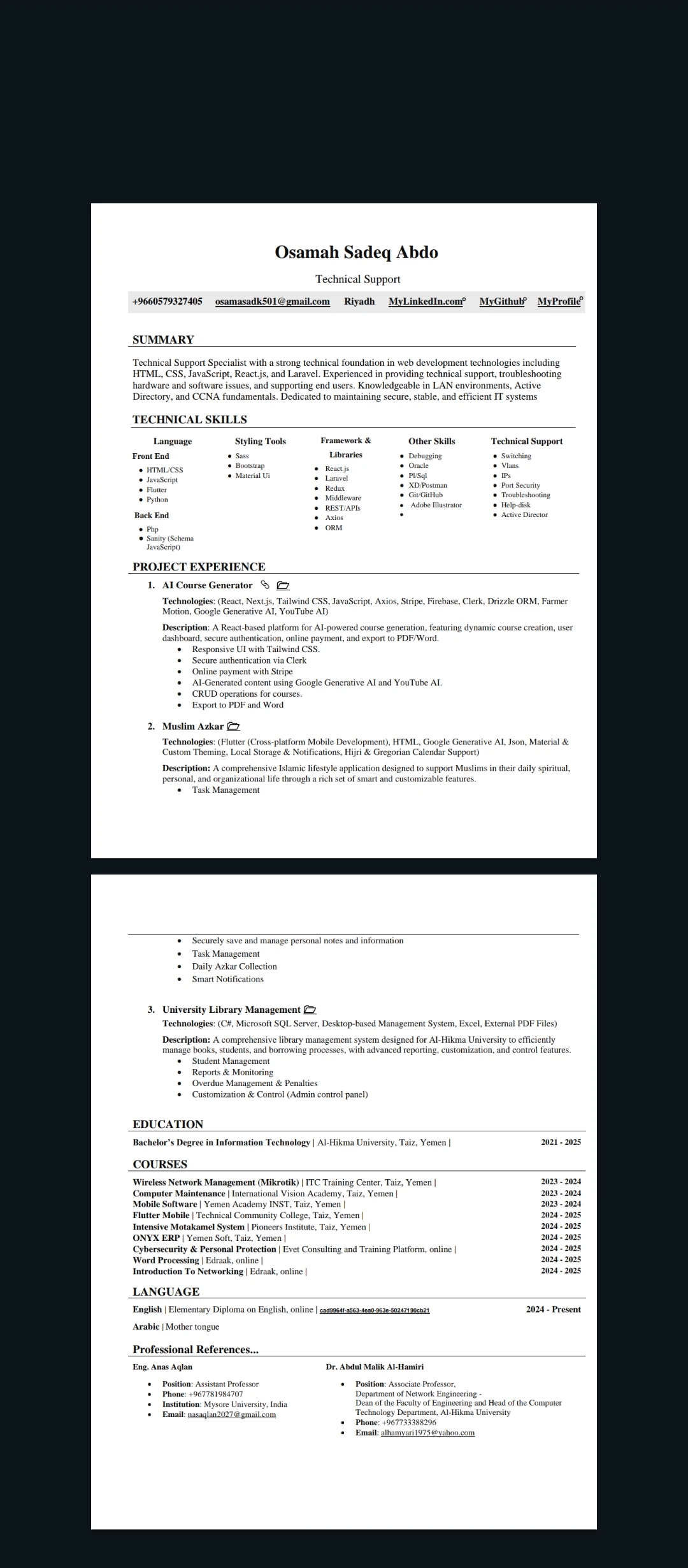 Technical Support Specialist with a strong technical foundation in web development technologies including HTML, CSS, JavaScript, React.js, and Laravel. Experienced in providing technical support, troubleshooting hardware and software issues, and supporting end users. Knowledgeable in LAN environments, Active Directory, and CCNA fundamentals. Dedicated to maintaining secure, stable, and efficient IT systemsپیدائش کی تاریخ
